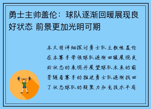 本文将详细探讨勇士队主教练盖伦在本赛季带领球队逐渐回暖、展现良好状态的表现,并展望球队未来的前景。随着赛季的推进,勇士队逐渐找回了状态,球队的凝聚力和竞技水平有了显著提升,这不仅增强了球迷的信心,也让外界对球队的未来充满期待。盖伦作为主帅,不仅调动了球员们的积极性,还在战术部署上做出了精准的调整。本文将从盖伦的领导能力、战术调整、球员表现以及球队未来四个方面深入探讨勇士队的进步与前景,分析盖伦如何带领这支球队走向更加光明的未来。